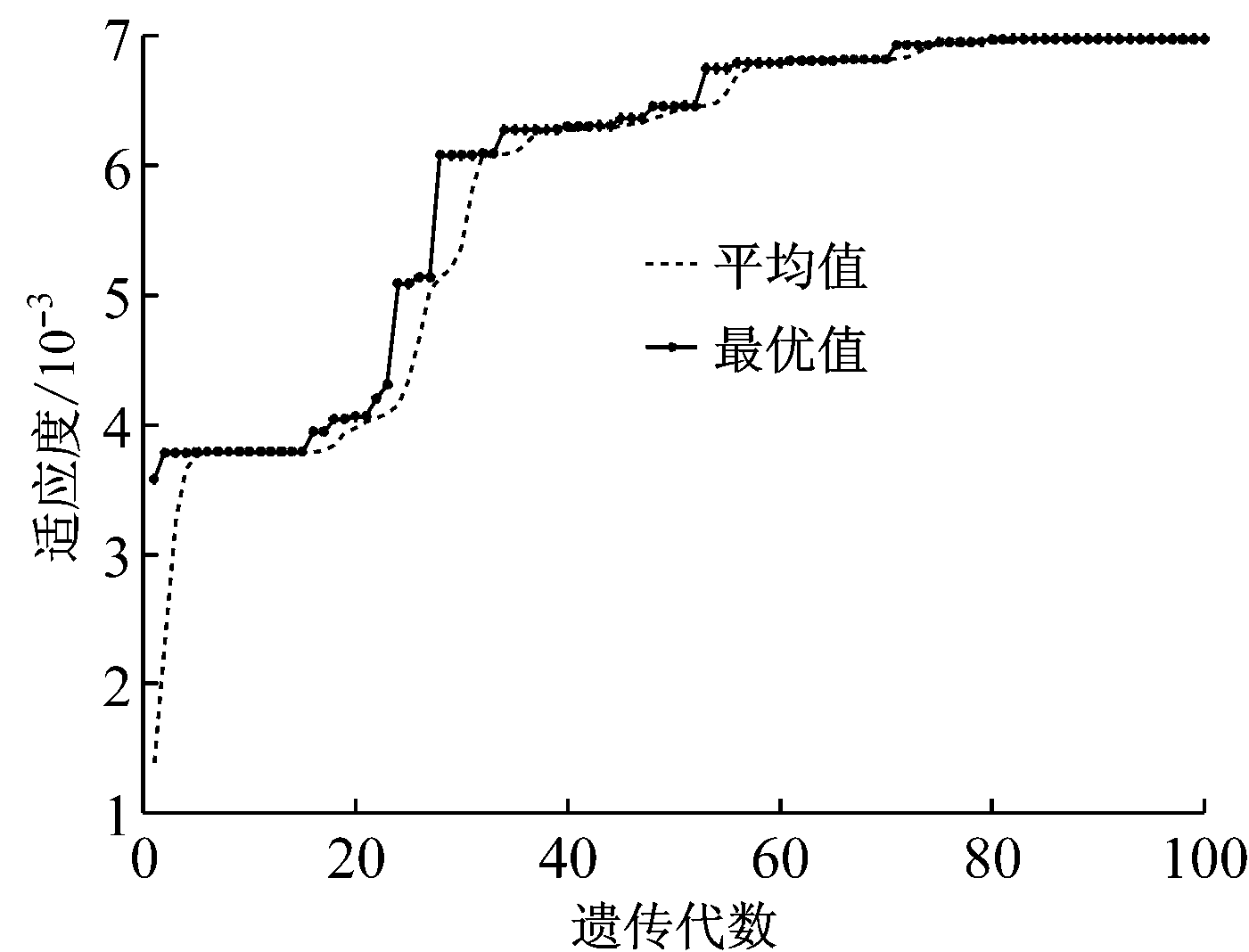 图8为遗传算法的适应度变化曲线,当遗传算法收敛时,适应度值随着遗传代数的增加而增大。