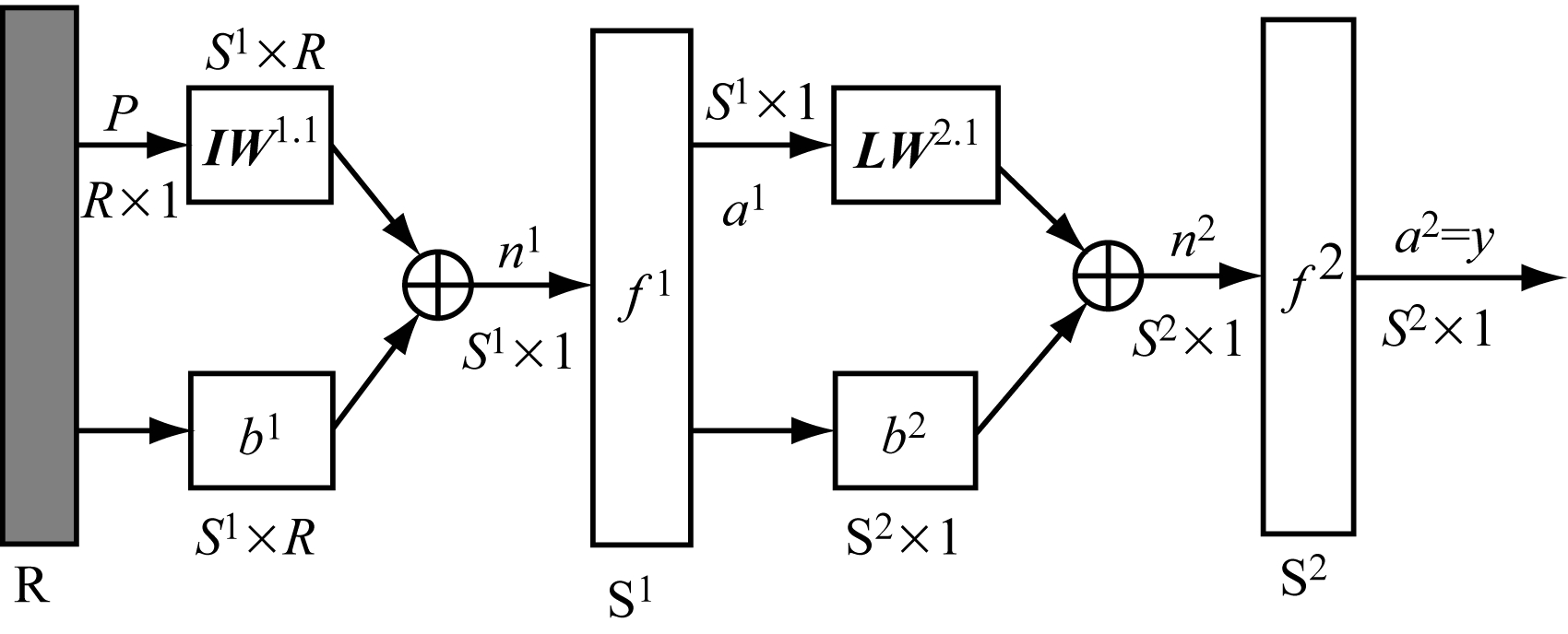 根据kolmogorov定理,在一定范围内,用含有一个隐含层的BP网络可以完成任意n维到m维的映射[7-9]。图5为具有1个隐含层的BP神经网络模型[10]。R为输入层,S1为隐含层,S2为输出层,IW1.1为输入层的权值矩阵,LW2.1为从隐含层到输出层的权值矩阵,n1和n2为神经网络层数,b1和b2分别为隐含层和输出层的阈值,f1和f2分别为隐含层和输出层的神经元传递函数。