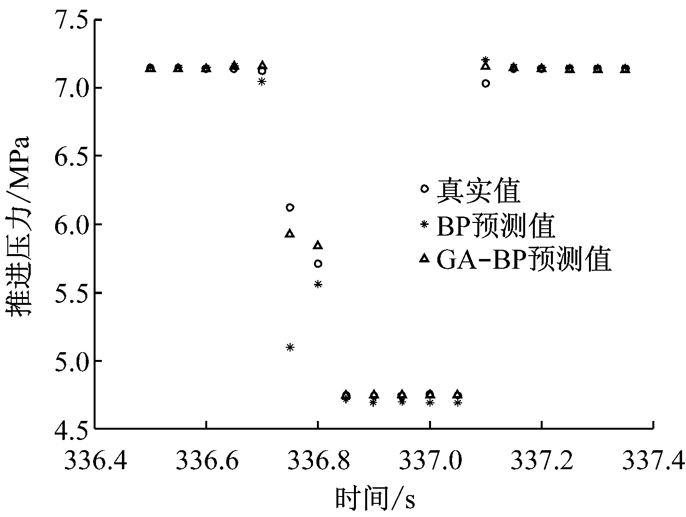 图10为推进压力的真实值、BP神经网络模型预测值和GA-BP预测值。从图10可以看出,BP神经网络模型和GA-BP网络模型均可以较好地预测卡钎时防卡阀的推进压力。