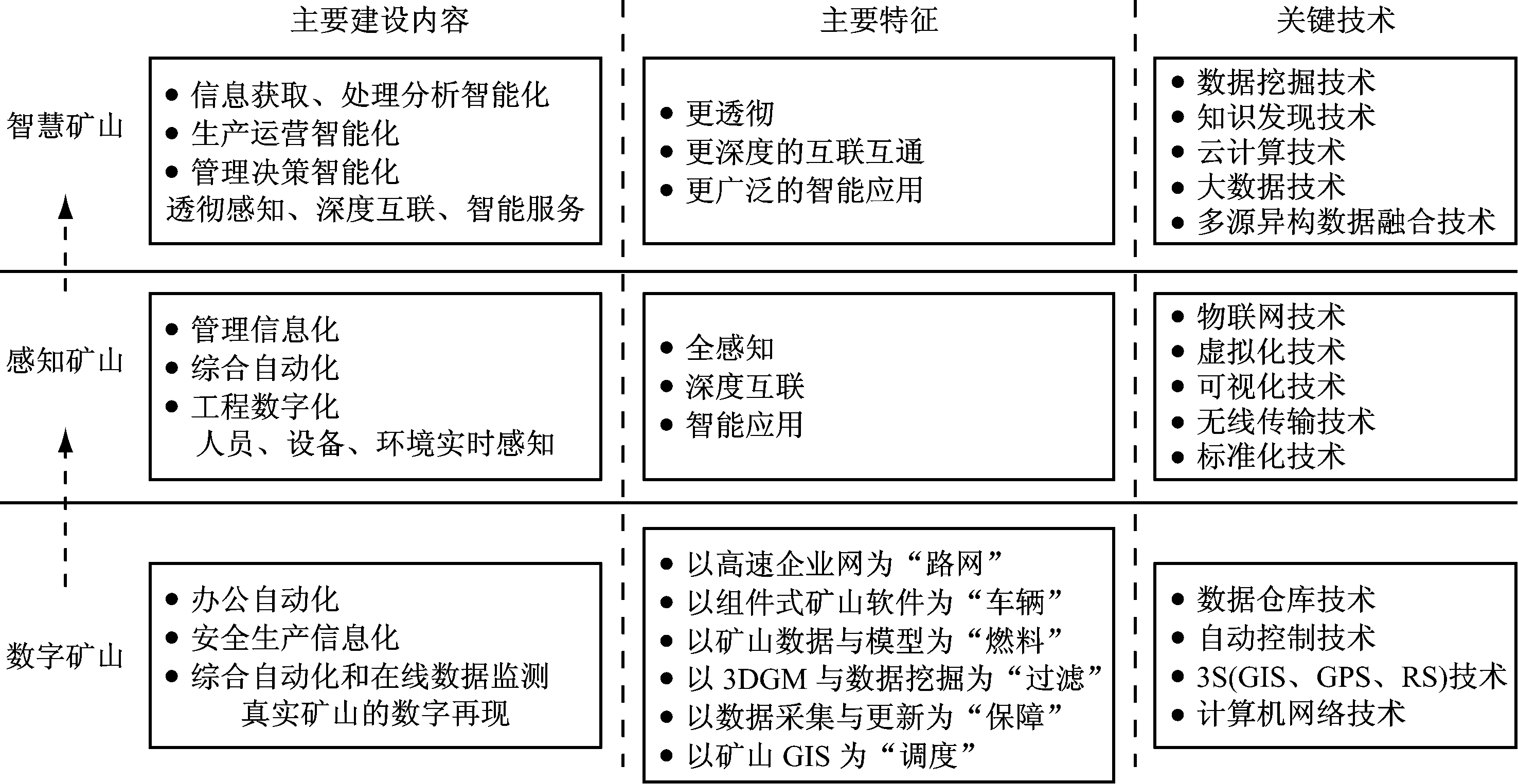中国煤矿信息化经历了数字矿山、感知矿山阶段,目前正向智慧矿山迈进。煤矿信息化建设3个阶段的主要建设内容、特征及其关键技术如图1所示。