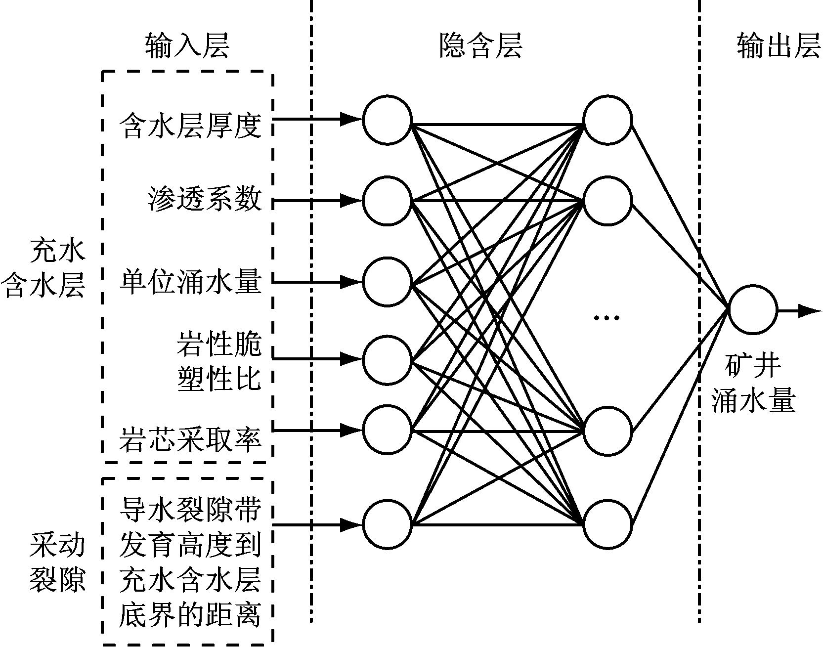矿井涌水量预测的准确性不仅取决于对矿井充水条件的正确分析和计算参数的合理选取,也与预测方法的科学性密切相关[2]。目前常用的矿井涌水量预测方法可大致归为确定性方法和非确定性方法两大类,其中确定性方法包括解析法、水均衡法、数值法、物理模拟法等,非确定性方法包括水文地质比拟法、相关分析法、BP神经网络、灰色系统理论等[2]。本文采用BP神经网络和大井法分别计算了陕西某煤矿二、三采区的5个工作面涌水量,并对预测结果进行了对比分析,最终选用BP神经网络的预测结果作为制定该矿井疏水降压方案的依据。