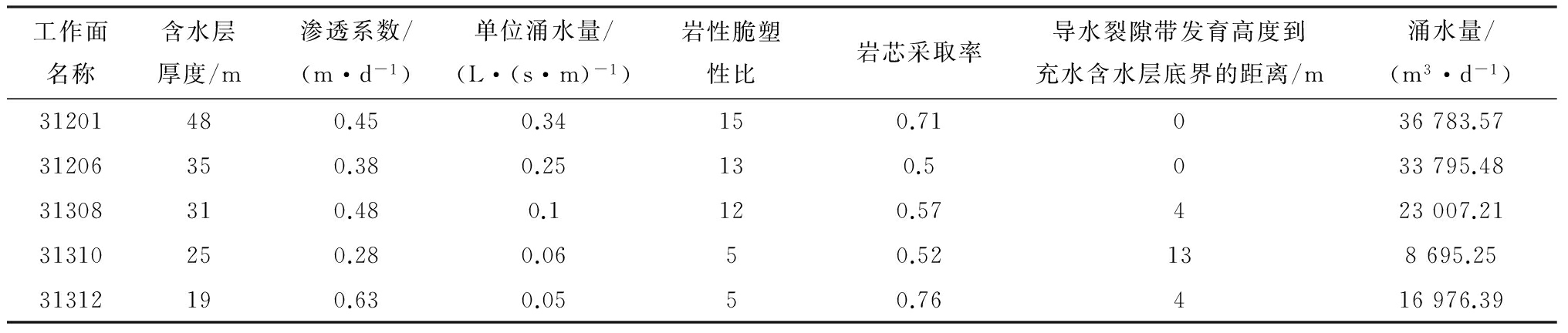 (1) 充水含水层。目前该矿井主采3-1煤层的充水水源主要为地下水,其直接充水水源为直罗组孔隙裂隙承压水,间接充水水源为松散层孔隙潜水,故直罗组孔隙裂隙承压含水层的富水性强弱将直接影响涌水量的大小。一般而言,充水含水层的厚度、渗透系数、单位涌水量越大,含水层的富水性越强。此外,含水层的岩性脆塑性比(岩性脆性岩与塑性岩厚度比)越大或岩芯采取率越低,说明含水层的岩石裂隙发育程度越高,渗透性越强,含水层富水性也越强[3]。因此,根据该矿井资料,矿井5个工作面充水含水层的渗透系数、含水层厚度、单位涌水量、岩性脆塑性比、岩芯采取率等指标可以综合表征直罗组孔隙裂隙承压含水层的富水性强弱,并直接影响5个工作面顶板涌水量的大小。