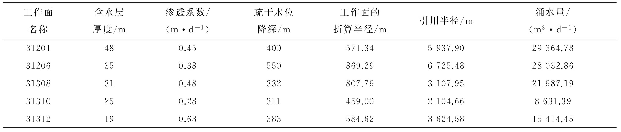 将各参数代入式(2)即可得到预测工作面的涌水量,具体参数值及涌水量计算结果见表2。
