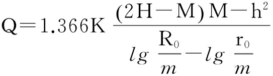 本矿井煤层顶板涌水量主要来自其直接充水的直罗组孔隙裂隙承压含水层,该含水层岩性相对较单一,在矿井疏排水过程中,地下水水流会在疏降区形成一个相对稳定降落漏斗,符合裘布依方程设定的条件。在疏降区范围内,承压水位将降至含水层底板以下,因此采用承压转无压的地下水动力学公式(式(2))进行预测较合理[8]。