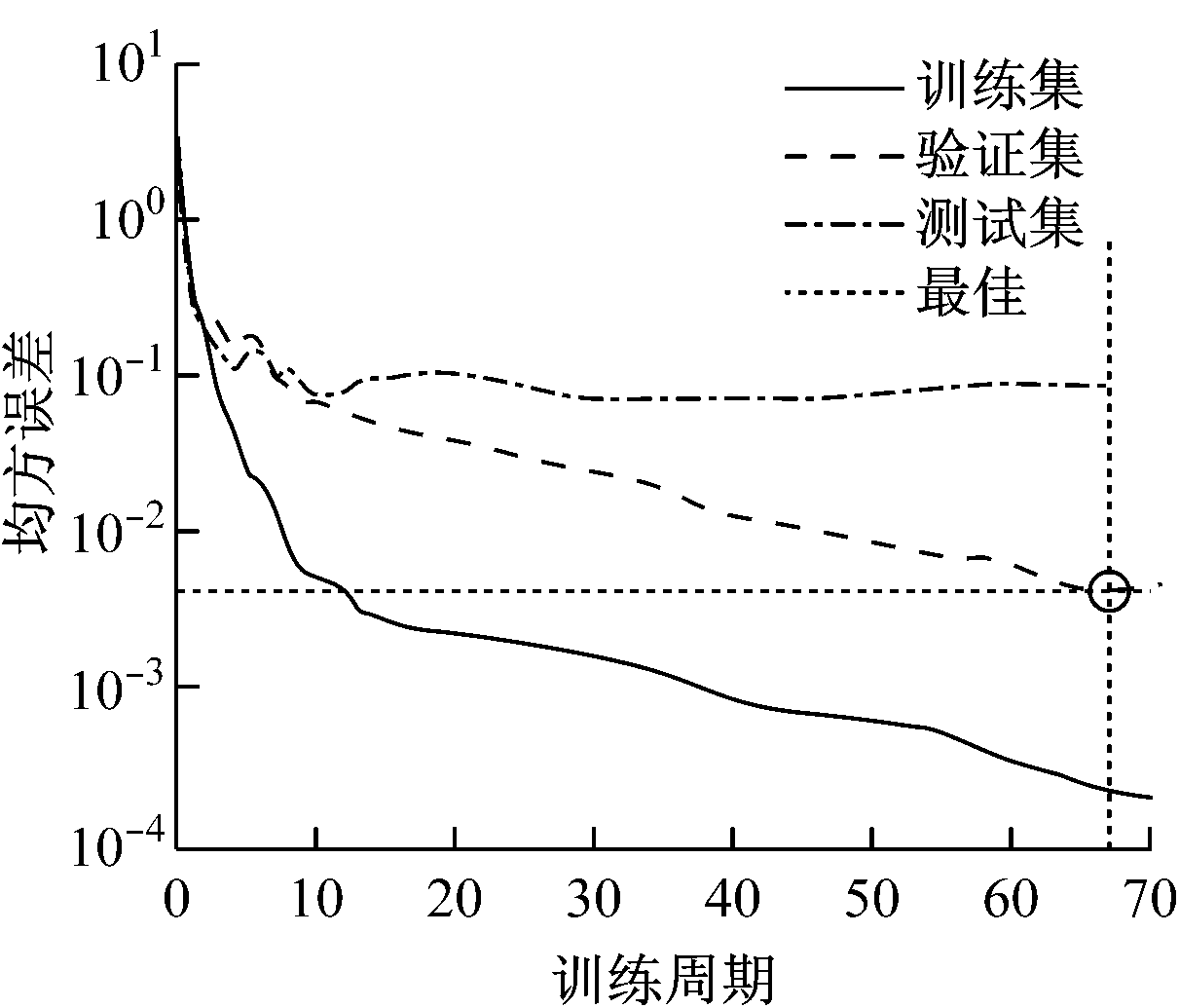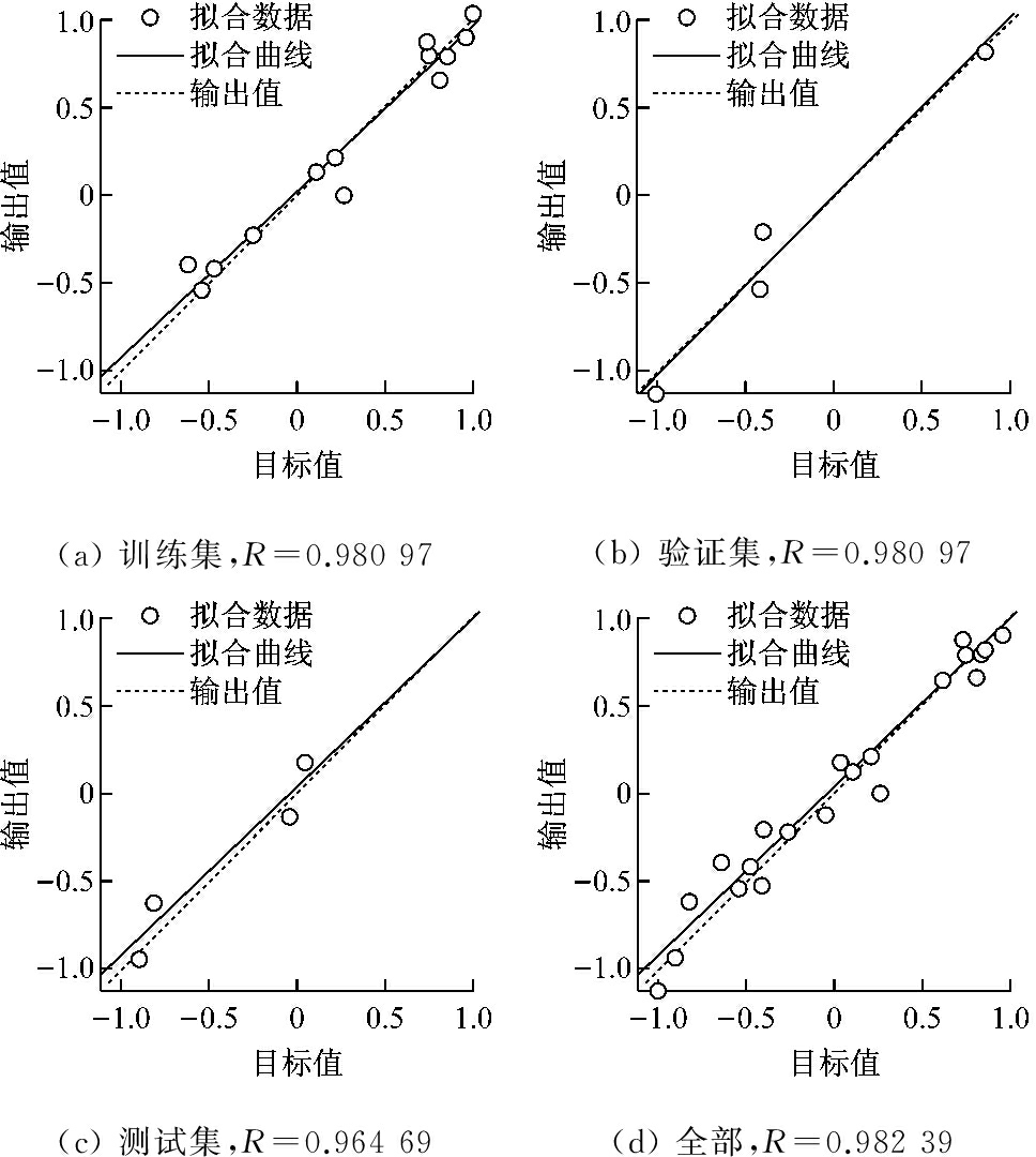 采用本矿井多个工作面的上述6个矿井涌水量影响指标作为输入信息,实测涌水量作为输出信息,进行模型参数识别与验证,并将其中22组数据作为训练样本进行学习。为了防止神经网络学习训练出现过拟合,神经网络工具箱将训练数据随机划分为训练集、验证集和测试集。其中训练集用于学习训练;验证集用来验证网络模型的泛化能力,并在过拟合前停止训练;测试集在网络训练过程中没有接触模型,它作为一个完全独立的样本来检测网络模型的准确性。BP神经网络训练结果如图2所示,通过73次训练,验证集最好的性能出现在第67次训练周期,其均方误差为0.004。 且3个数据集的网络模型输出值与目标值间的相关关系较好,相关系数R在0.96以上,如图3所示。由图3可知,所建立的BP神经网络模型较可靠,可以用来预测其他工作面的涌水量,预测结果见表1。