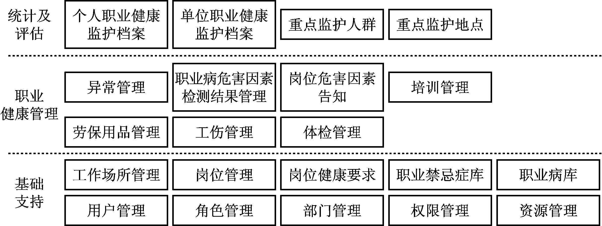 (1) 基础支持模块。主要对企业现有的工作场所进行维护,对各岗位接触的工作场所、各岗位健康要求(职业禁忌症、职业病等)进行管理。