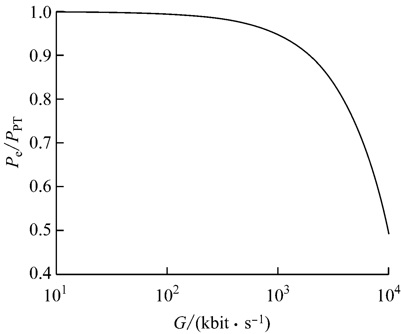 式(6)揭示了MPT系统发送功率与传感器节点数据传输速率之间的关系。数据传输速率G值越大,意味着平均能量传输功率Pe越低。τ=0.6 ms,L=1 470 B(UDP协议)时,Pe/PPT与G之间的关系如图2所示。可看出,Pe/PPT随G值增大不断下降,也就是说,为了给传感器节点提供更多的能量,必须降低传感器节点的数据传输速率。