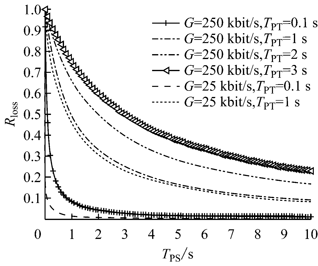 从图3可看出,随着TPS增大,在高速率G=250 kbit/s下,输能间隔TPT越小,Rloss越小。对比G=25 kbit/s和G=250 kbit/s时的曲线可知,TPT越小,G对Rloss的影响越大;TPT=1时,Rloss在2种速率下的差距不大。