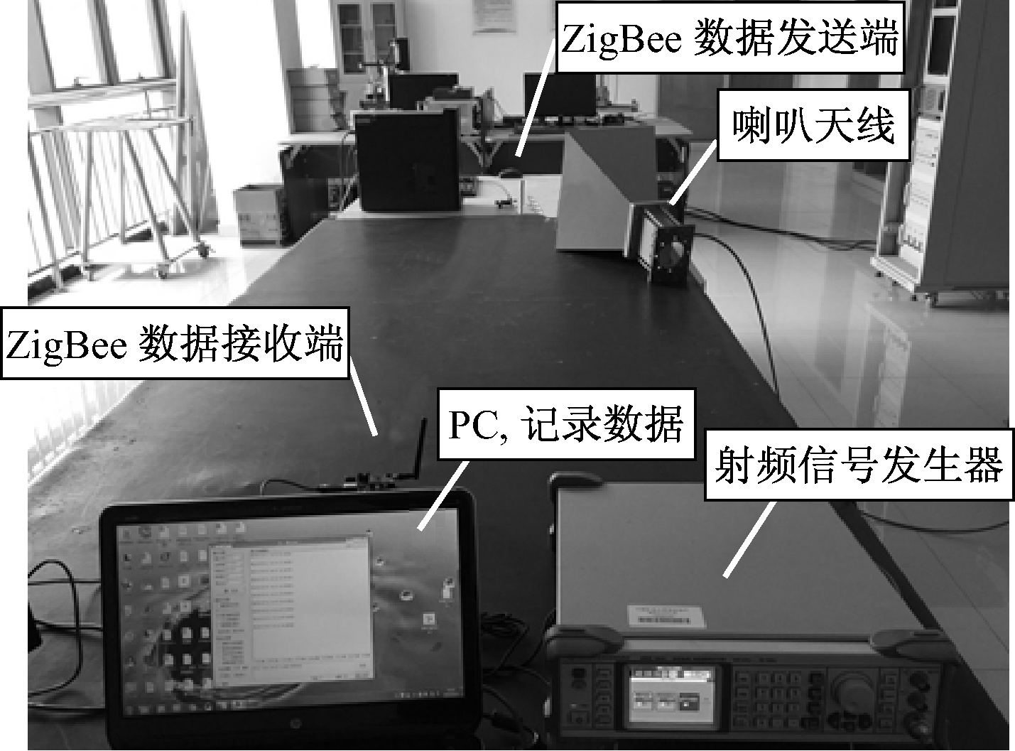 在实验平台右侧放置1个喇叭天线,作为MPT输能端,用于干扰ZigBee数据发送端,距离ZigBee数据发送端约为1 m。喇叭天线连接射频信号发生器(型号为Rohde&Schwarz SMB100A),用于提供稳定的2.4 GHz射频信号。考虑辐射安全因素,输能端没有加功率放大器,但为了清晰地观测输能端对ZigBee通信的影响,将ZigBee发送功率设为-22 dB·m,射频信号发生器功率设为16 dB·m。由于技术指标限制,射频信号发生器的射频开关最小间隔只能达到1 s,即TPT最小为1 s。