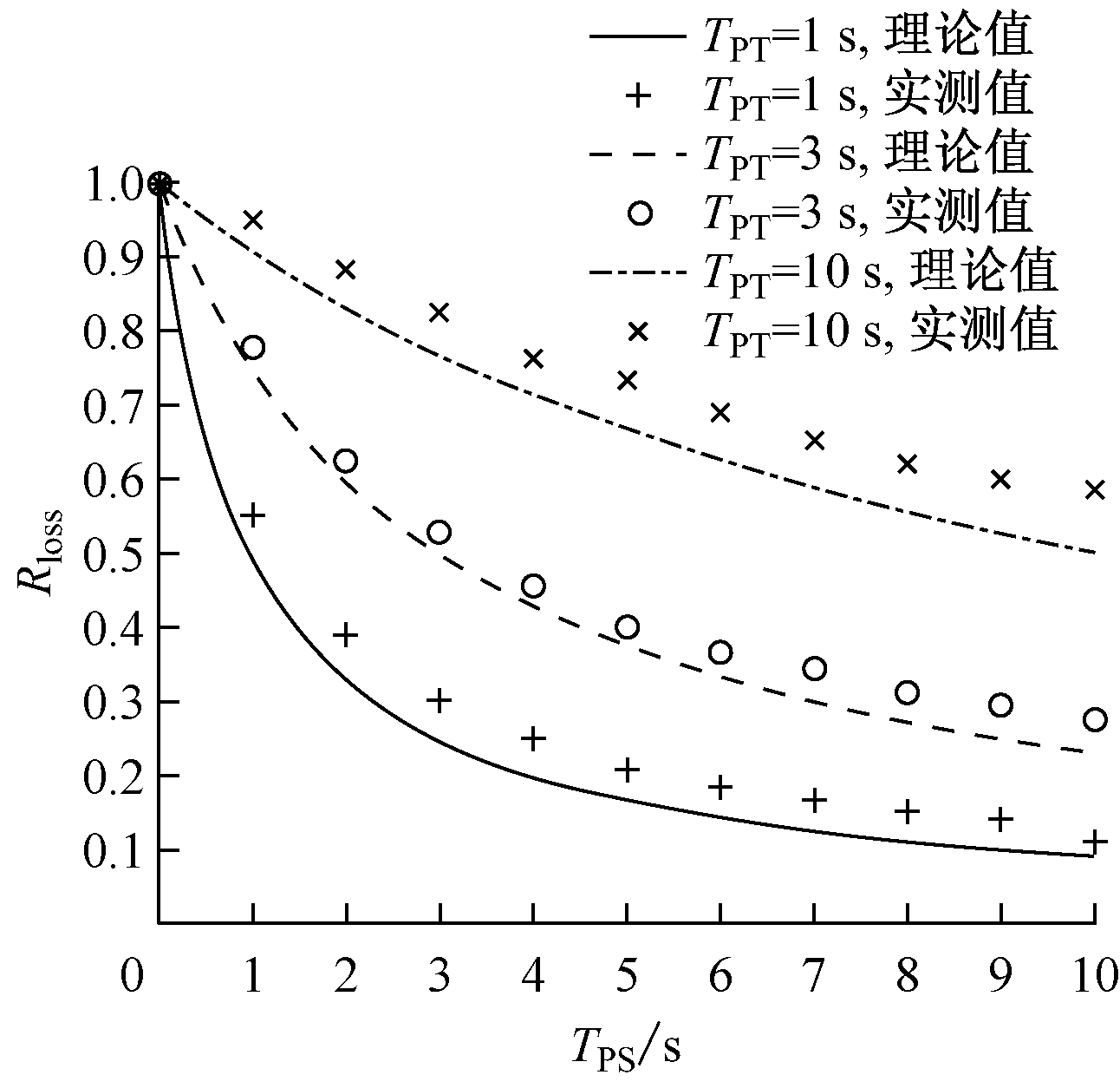 图6为TPT=1,3,10 s时Rloss实测值与理论值对比。可看出Rloss实测值与理论值趋势一致,但实测值更大,这可能是由测量误差和ZigBee通信时的意外丢帧造成的。