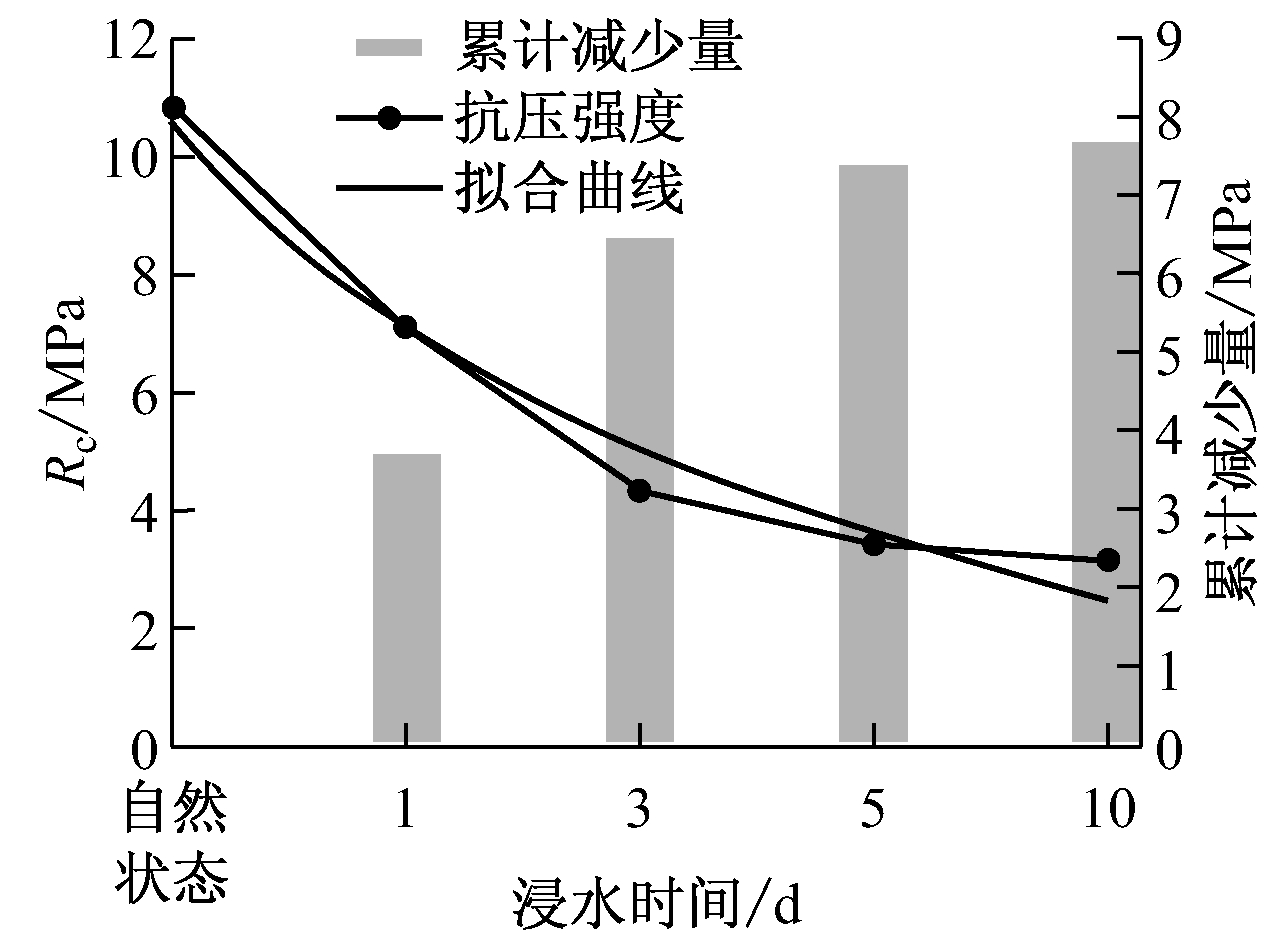 从图1可看出,在自然状态下,煤样抗压强度为10.848 MPa。经过浸泡以后,煤样抗压强度呈现持续下降趋势,浸泡10 d以后,试样抗压强度达到最小值3.154 MPa,最大累计减少量为7.694 MPa,相较于自然状态,下降幅度达到70%以上。试样浸泡1~3 d后,试样抗压强度减小速率最快,达到最大值3.74 MPa/d;之后,随着时间增加,抗压强度减小速率逐渐减小,尤其是在浸泡10 d以后,抗压强度减少量仅为0.291 MPa。由此可以得出,3号煤层试样在经水润湿后,抗压强度明显降低,最佳浸水时间为1~3 d。浸水后煤的物理性质发生显著变化,煤体抗压强度降低,该结论可为煤层注水治理强矿压显现问题提供参考依据。