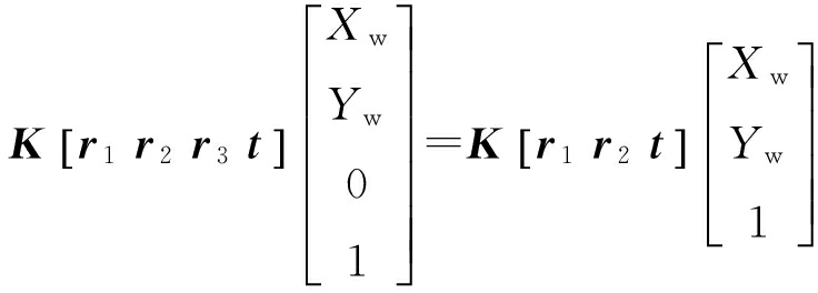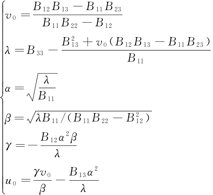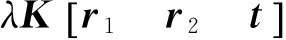 (2) 计算内外参数。有效范围内角点的世界坐标可以表示为[Xw,Yw,0]T,成像点坐标为(u,v),由摄像机成像坐标关系可得