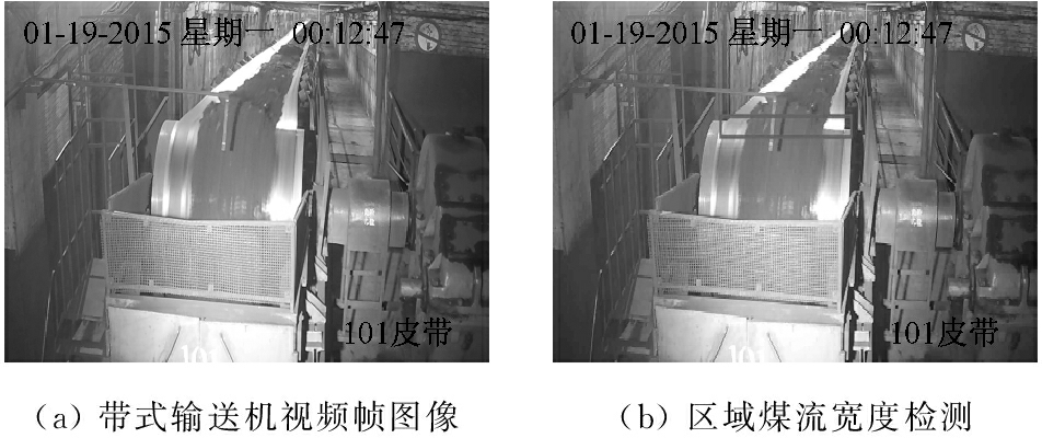煤流宽度检测结果如图7所示。图7(a)经过处理后,选择图7(b)中区域进行煤流宽度的检测,通过实验,得到煤流宽度为68 cm,小于临界堆煤宽度85 cm,故输送机处于正常输煤状态。