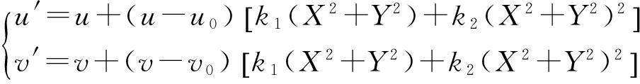 (3) 畸变系数的计算。以上都是理想状况下对基于摄像机线性成像模型的计算,但是在实际状况下,会存在非线性畸变,尤其是径向畸变。因一阶系数的径向畸变在摄像机的非线性模型中占主导地位,在线性摄像机模型下,假设某空间理想成像点的坐标为(u,v),成像点以物理量为单位在像平面上的坐标为(X,Y),而考虑畸变情况下成像点的坐标为(u',v'),由此可得