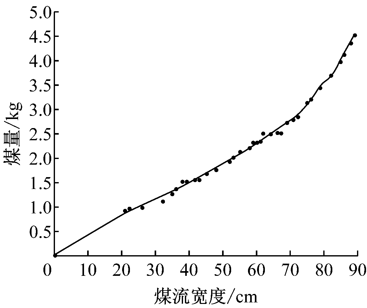 根据建立的小孔成像模型计算得出胶带上煤流的实际宽度,利用测出的宽度求出其对应的煤量。为了得到煤流宽度与煤量的对应函数关系,在某电厂带式输送机系统现场环境下,通过实验记录煤流实际宽度与对应煤量值数据,统计煤流长度为10 cm,统计数据见表1。
