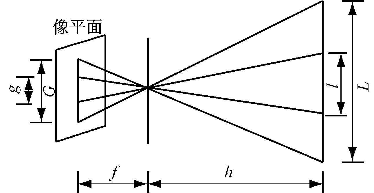 根据式(5),可以用小孔成像模型来描述带式输送机的视觉测距模型。本文中带式输送机监测系统的胶带宽度L固定为1 m,摄像机在系统中的位置是固定的,胶带在像平面的宽度G固定不变,设煤流在胶带上的宽度为l,煤流在像平面上呈现的宽度为g,利用小孔成像原理,建立小孔成像模型,如图4所示。
