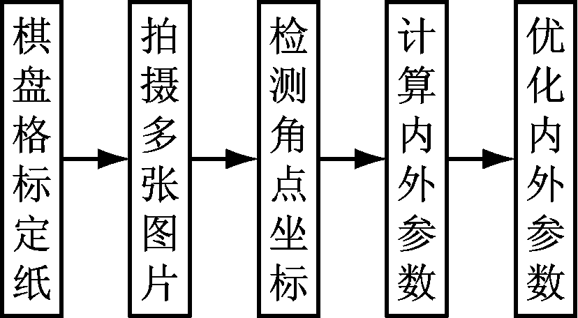 使用视觉测量技术实现胶带堆煤现象的检测,必须要得到物体表面的实际位置和图像表面位置的相互关系参数,即摄像机成像模型参数,实际中通过对摄像机的标定求得摄像机的成像模型参数。本文的摄像机标定选用张氏标定法。张氏标定法是一种基于平面模板的标定法[3],操作比较简单,鲁棒性较好,且精度较高。张氏标定法流程如图2所示。