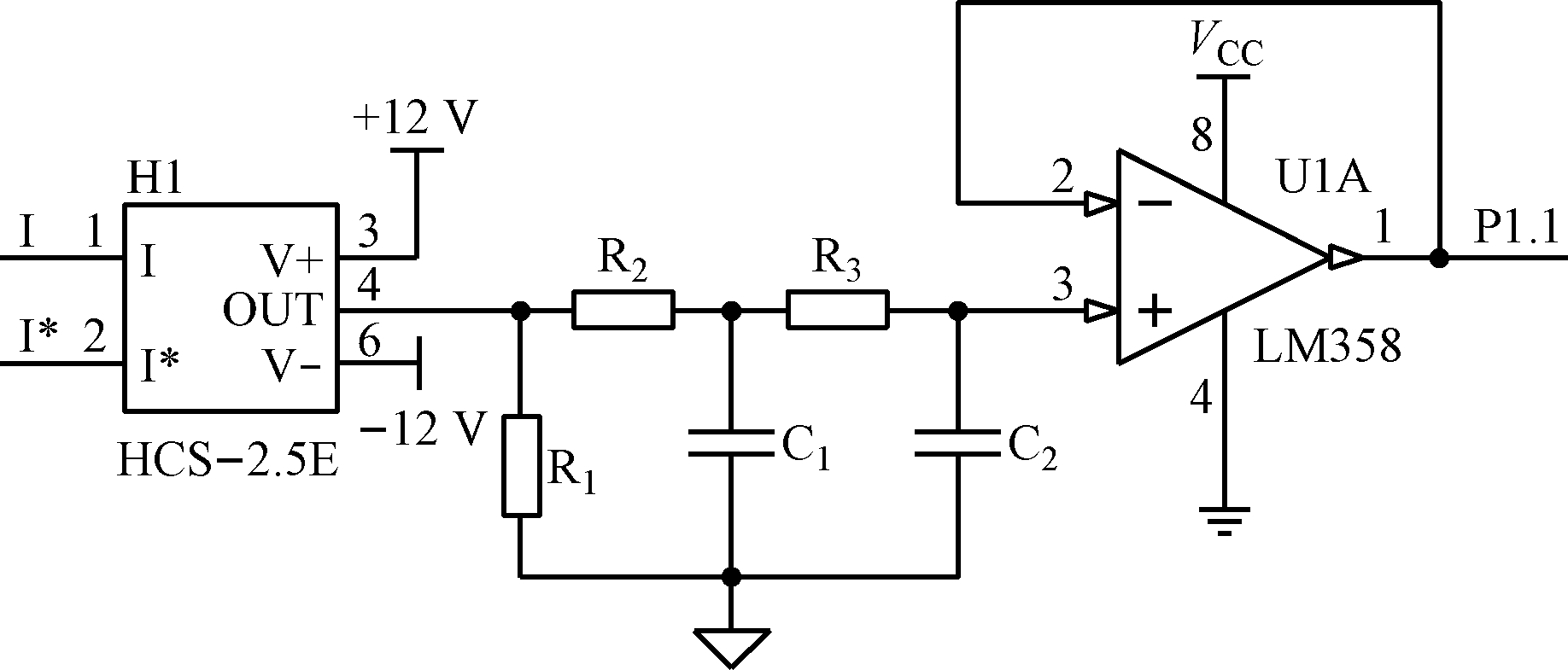 高压断路器分合闸线圈一般都采用直流电磁铁[8]。本文采用HCS-2.5E闭环霍尔电流传感器采集分合闸线圈电流信号。该型传感器具有精度高、线性度好、反应速度快、性价比高的特点,额定输入2.5 A时的额定输出为25 mA,测量范围为0~3.6 A。该电流传感器不仅可将大电流变成小电流,还可实现线圈电流和电路板电信号的隔离,提高了测试电路的抗干扰能力。分合闸线圈电流采集电路如图4所示。传感器输出的电流信号经电阻R1后转换为ADC可以处理的电压信号。R2、R3,C1、C2,以及LM358组成了二阶有源滤波电路,用于消除高频干扰。