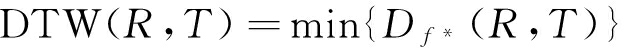 从代价矩阵中找到一个使元素间累计距离最小的路径,以达到2组序列的最佳匹配。R与T之间的规整路径f的累计代价函数可表示为Df(R,T),它是关于局部代价度量D(·)的加权和,即