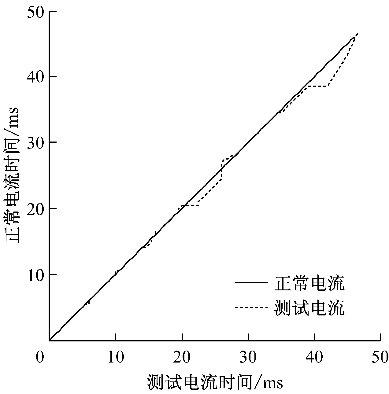 使用Itakura窗的DWT算法对故障波形1重新进行诊断,结果如图10所示。在42~46 ms内,Itakura窗限制了最优规整路径,使其只能沿约束窗的边界规整,规整路径不正确,所以在断路器分合闸线圈的故障诊断中,Itakura窗在终点(或起点)的约束与Sakoe-Chiba窗相比显得不够合理。