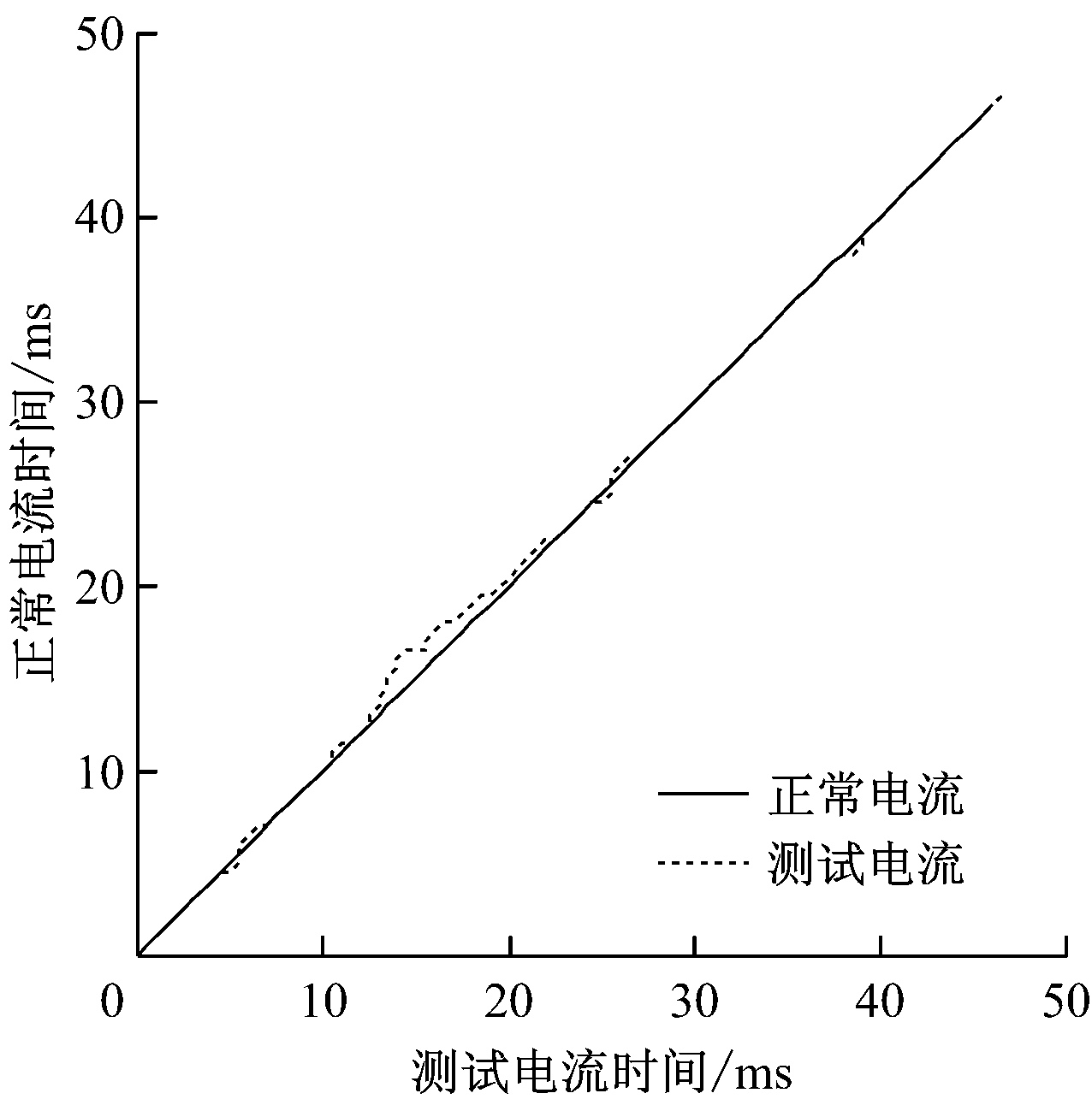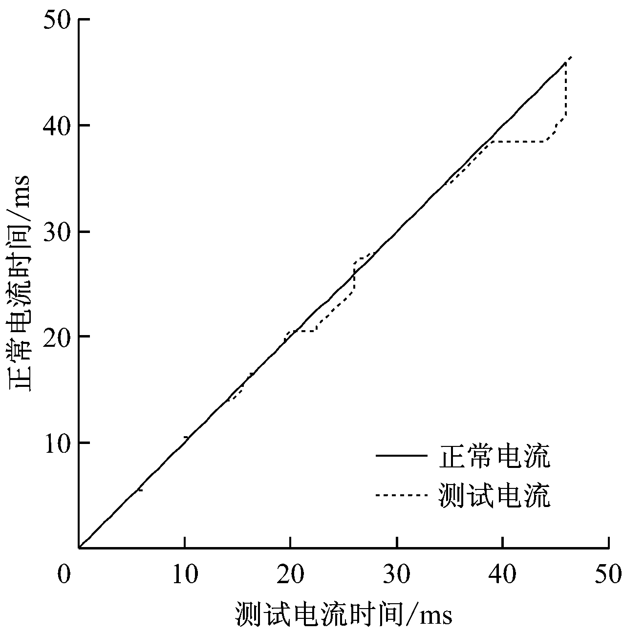 采用添加Sakoe-Chiba窗的DTW算法对故障波形1进行诊断,结果如图8所示。由图8可得,故障波形1在20~26 ms内相对正常电流波形出现明显的滞后现象,在39~46 ms内相对正常电流波形也出现明显的滞后现象。其原因是延长分闸线圈铁芯运动的空行程后,在空行程增大的时间里分闸线圈电流继续减小,而后在铁芯撞击分闸脱口器后电流再升高,致使在20~26 ms内出现故障电流滞后于正常电流的情况。因为分闸时间变长,所以分闸线圈电流被切断的时间被延后。图6所示的分闸线圈电流波形与正常电流相比,在最后多出一个小波峰,用DTW算法对故障波形进行最优规整时,显示为39~46 ms内的滞后。