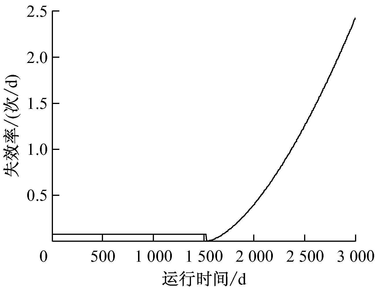 Weibull分布在失效率函数的拟合与可靠性评估中应用十分广泛,传统的二参数Weibull分布老化失效从运行开始就存在,不符合实际情况。三参数Weibull分布在临界点以前只出现偶然失效的现象,从临界点开始才出现老化失效的现象,与实际情况下的失效率曲线完美贴合,故选用三参数Weibull分布对失效率函数进行拟合。