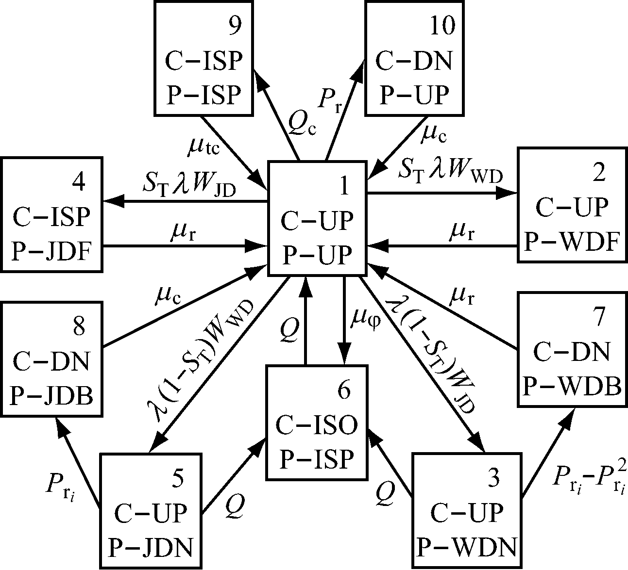 系统最初处于状态1,此时继电保护和线路均为正常状态;当线路发生故障,则进入状态10,经过故障后修复,回到状态1;当经过线路定检时间Qc,系统进入状态9,线路处于定检状态,继电保护处于隔离状态,经定检修复率μtc修复后,回到状态1;同理,状态6为经保护定检时间Q而进入定期检修,线路处于停运隔离状态,经定检修复率μφ修复后,回到状态1;当线路正常工作而继电保护的自检功能(ST为自检率)检测到保护异常时,系统进入状态2或状态4,经保护修复率μr修复后重新回到状态1;当继电保护将要发生误动,但未被自检功能发