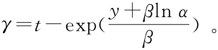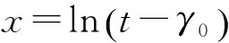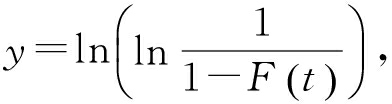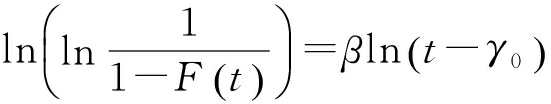 假设位置参数初值为γ0,将三参数Weibull转换为二参数Weibull,对失效分布函数(式(5))两边取对数,得