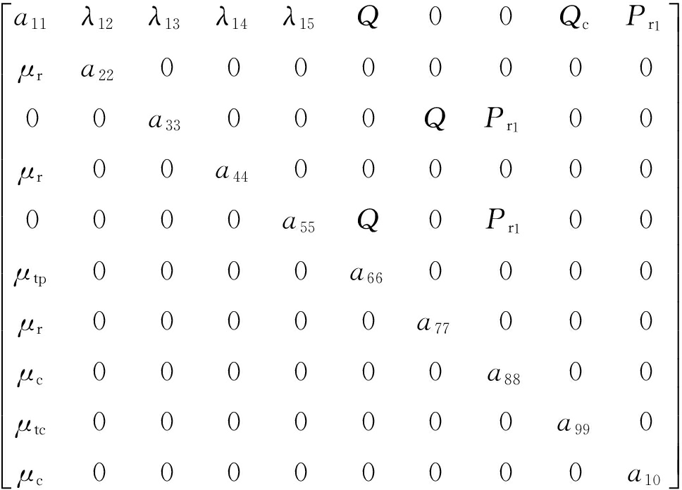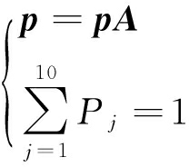 对于上述10状态Markov模型,设驻留概率矩阵为p =[P1 P2 … P10], 建立时变状态概率微分方程组,则驻留概率满足如下方程