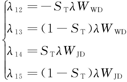 式中:ajj(j=1,2,…,10)为第j行所有元素之和的相反数;μtc,μtp分别为不同条件下的定检修复率;λ12,λ13,λ14,λ15分别为线路间的失效率,计算公式如下: