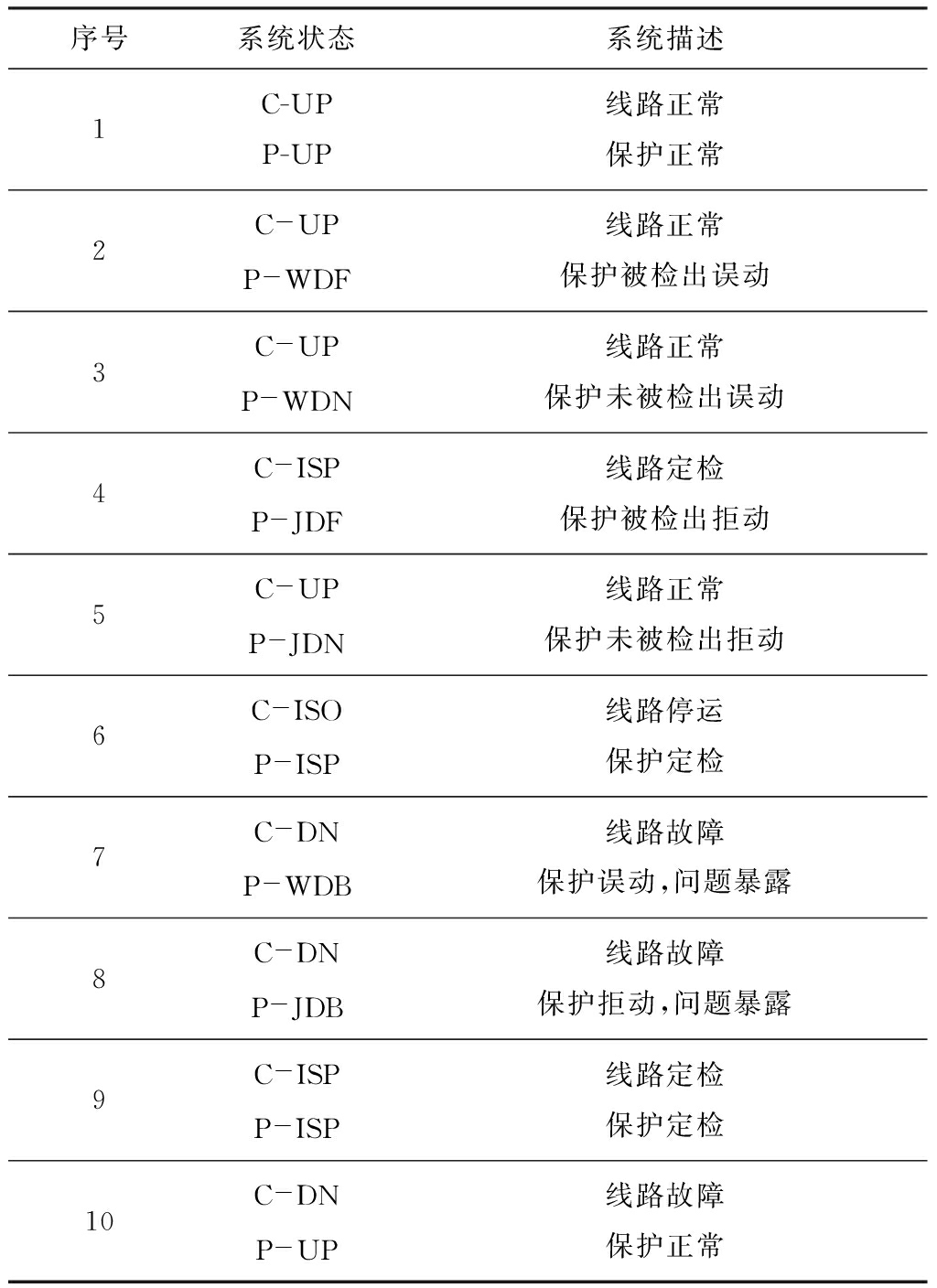 根据被保护元件(C)和保护装置(P)的4种工作状态(正常运行 (UP)、故障 (DN)、定期检修(ISP)和线路停运(ISO))对线路-保护系统组成进行划分,最终划分出的10种状态见表1。