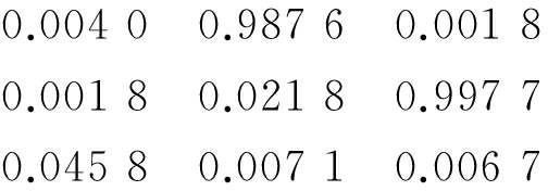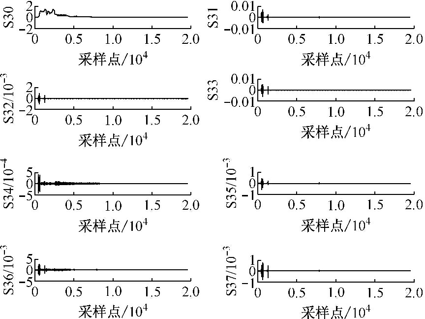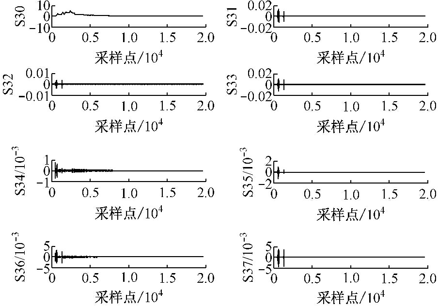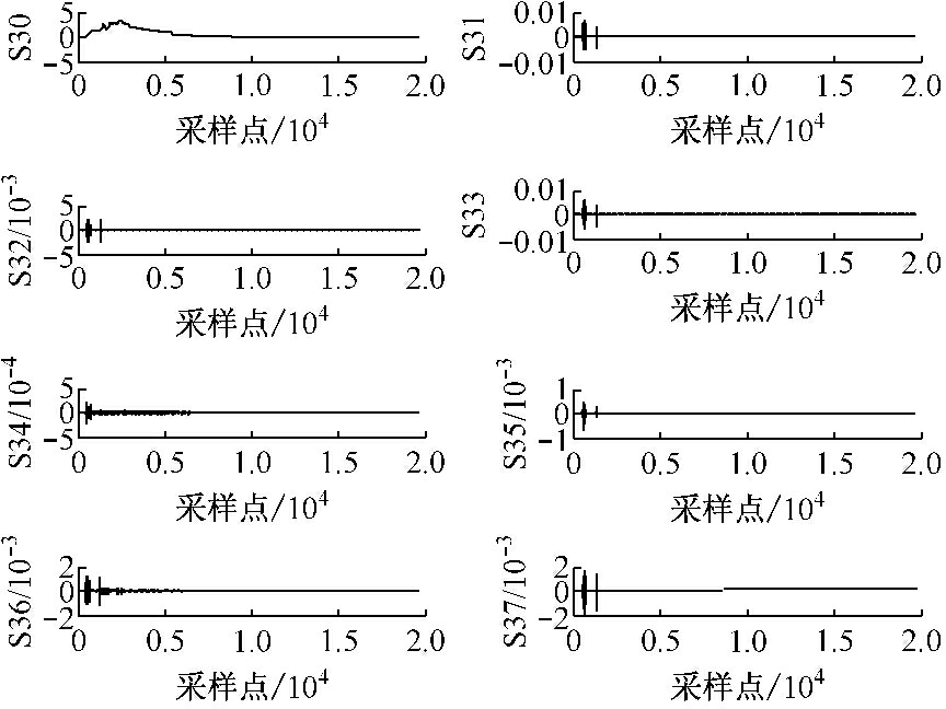 设0.01 s时线路3在5 km处发生A相接地短路故障,0.1 s结束,算法采用ode15s,消弧线圈的RL参数设置为R=25 Ω,L=0.87 H。在Matlab中对零序电流的5次谐波进行3层小波包分解。线路1,2,3零序电流的5次谐波第3层重构系数S30—S37如图2所示。