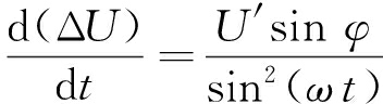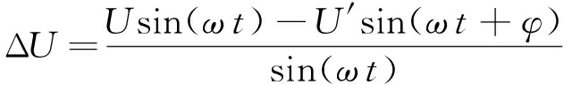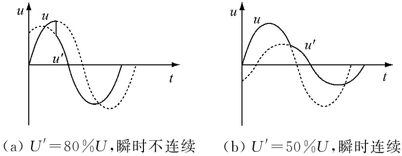 式(15)、式(16)表明,若电网电压发生相位突变,由式(13)得到的|ΔU|会不断增大,在接近nπ(n∈Z)时,|ΔU|近似于无穷。此时对于图2(a)所示的不应切换的电压跌落,采用该方法会造成误动作。而对于图2(b)所示情况,在电网电压突变后,因突变前后的电压瞬时值恰好相等,UPS系统会等待ΔU超过某一值后再进行切换动作,存在一段时间延迟,而不能够迅速切换。