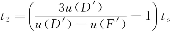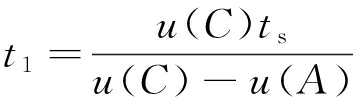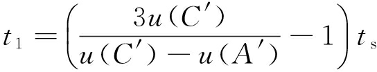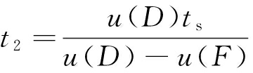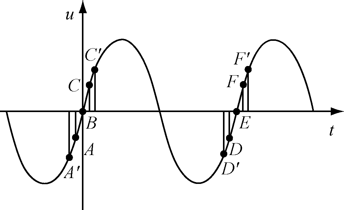 图1中,A′,A,C,C′,D′,D,F,F′为电压采样点,但不是电压过零点;B,E为电压过零点。假设B点到C点的时间间隔为t1,D点到E点的时间间隔为t2,在A,C,D,F点的采样电压分别为u(A),u(C),u(D),u(F)。在电压过零点附近,曲线AC,DF可近似视为直线,则有