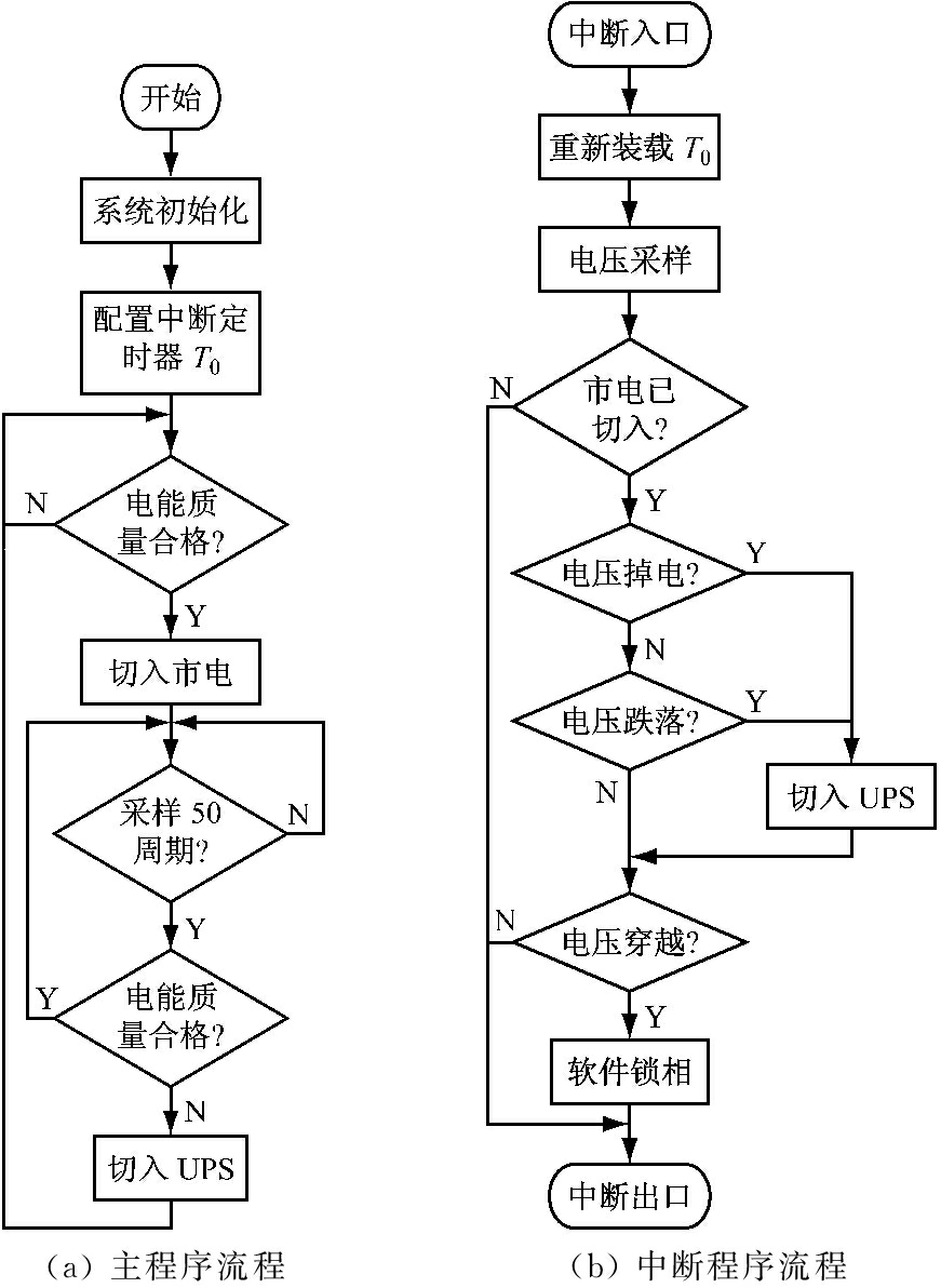 为快速准确地进行UPS系统切换,应注意以下3点:① 根据系统采样点,利用软件锁相环进行相位同步;② 每采样1点,首先进行掉电检测,若检测到电网电压掉电,马上切换,不必进行电压跌落检测;③ 采样点在未检测到掉电时,应进行电压跌落检测,如果电网电压跌落超出预定范围,则应立即进行切换。