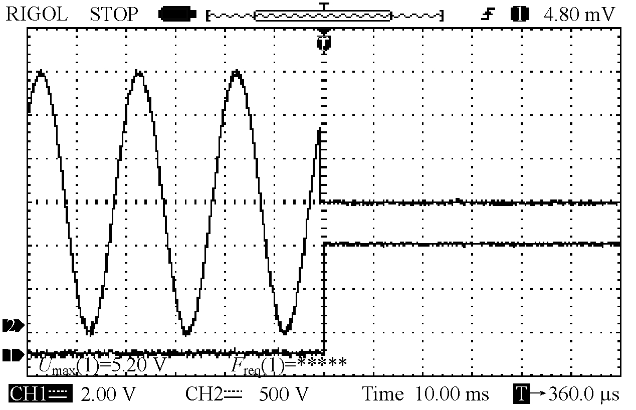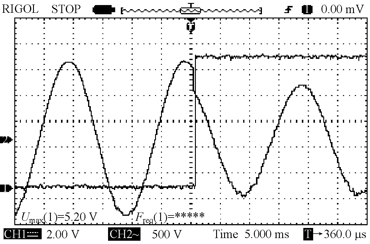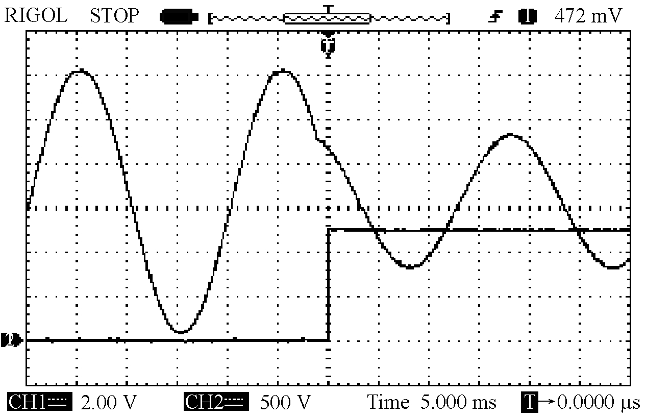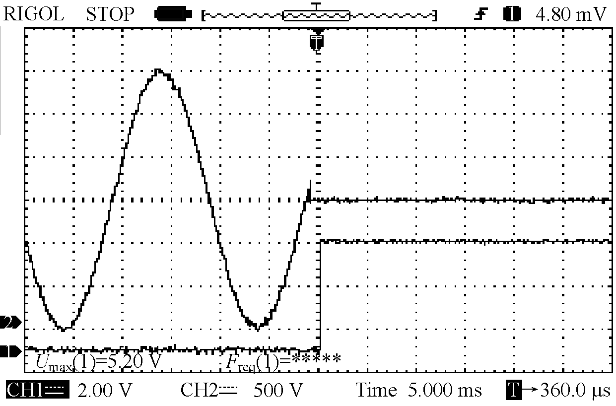 以TMS28335浮点型DSP为核心搭建实验平台,设采样频率为12.8 kHz。测试信号由12位高精度数模转换芯片组成的可编程信号发生器模拟产生。因TMS28335引脚驱动能力不足以驱动继电器,外扩74LVC4245电平转换芯片来提高其驱动能力。通过示波器的单次触发功能观察实验波形,如图5所示。