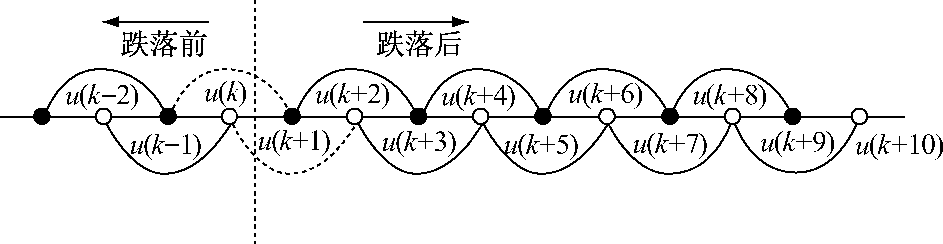 假设在采样点u(k)与u(k+1)之间发生电压跌落,如图3所示。令n=2,在发生电压跌落前,采用u(k)之前的采样点计算得到的电压幅值相等且相位连续;在发生电压跌落后,采用u(k+1)之后采样点计算得到的电压幅值相等且相位连续。