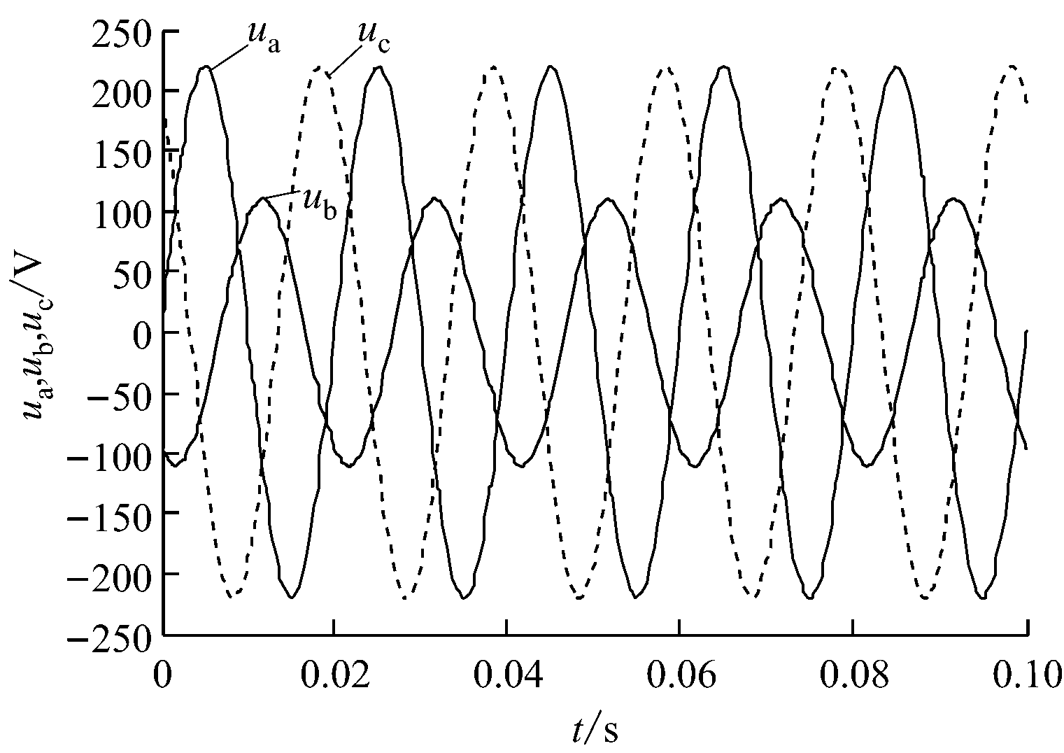 三相不对称电压波形与三相畸变电流波形如图3所示。如图3(a)所示,a相电压峰值为220 V,初始相角为0,b相电压幅值为110 V,相角滞后于