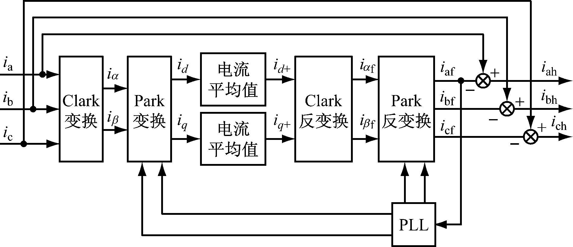 所得到的瞬时有功及无功电流通过低通波器可将其中的谐波分量分离出来,从而得到基波正序电流有功分量ip+和无功分量iq+。再将其分别经过Clark及Park逆变换,得到三相基波电流,其中分别含有有功及无功分量。其中基波正序电流有功分量为