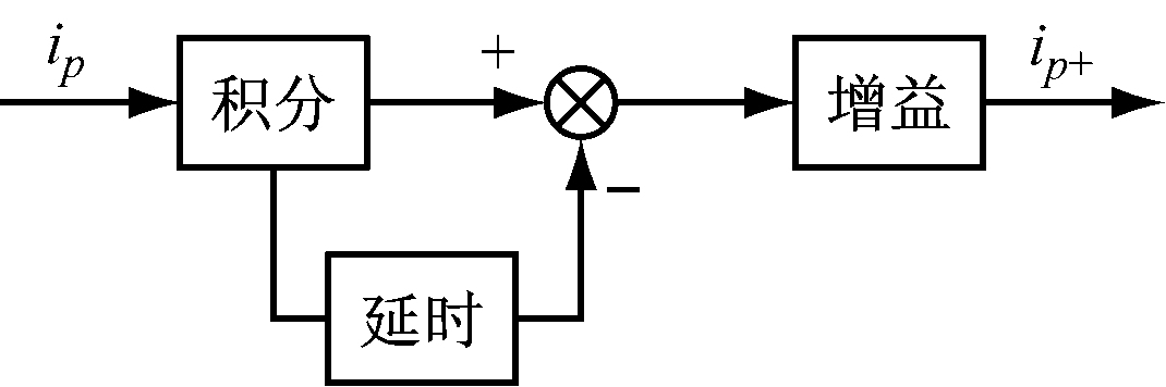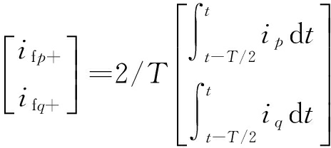由于在dq变换之后所获得的瞬时有功电流ip及瞬时无功电流iq中含有大量的谐波信号,在传统id-iq谐波检测法中,主要通过低通滤波器来滤除交流信号得到ip+及iq+,但是该滤除方式的效果取决于低通滤波器的性能,并且由于低通滤波器的固有延时,会降低谐波检测算法的整体速度与精度[3]。为降低延时,提高算法精度,本文采用电流平均值理论来取代低通滤波器,电流平均值主要由积分、延时及增益3个部分组成。由式(3)可知,经过三相静止坐标系到两相旋转坐标系变换后,正序分量次数将降低一次,负序分量则会升高一次,基波分量为直流分量,即变换前的奇次谐波分量经过转换后均为偶次分量。此时取积分周期为T/2(T为基波周期),可使积分后交流分量的均值为0。其原理如图1所示。