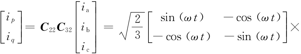 基于Clark及Park变换的id-iq谐波检测法是在瞬时无功功率理论的基础上,将得到的三相电流ia,ib,ic经过三相坐标到两相坐标的变换,变换到两相正交αβ坐标系下得到iα,iβ,再将其变换到旋转两相 d-q坐标系下,得到id,iq0,由运算可知,数值上id等于三相电流在两相旋转坐标系中有功分量ip,iq0等于无功分量iq;再经过低通滤波器分别得到基波正序电流有功分量ip+和无功分量iq+,通过三相静止到两相旋转坐标系变换后,三相静止坐标系下的基波正序电流分量转化为两相旋转坐标系下的直流分量,而其余需要补偿的分量在两相旋转坐标系中为交流分量,便于提取基波正序电流,有利于谐波电流的检测[8]。当三相电压对称且无畸变时,设t时刻三相瞬时电压及瞬时电流值如式(1)、式(2)所示。