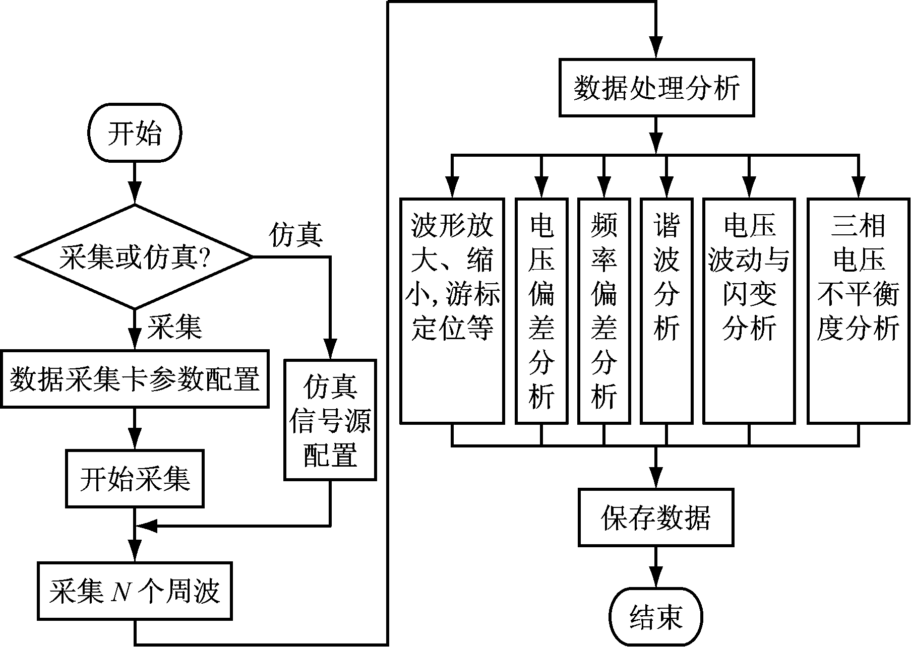 基于LabVIEW的煤矿电压质量在线监测系统软件主要完成对数据采集卡的配置,输入信号的还原、滤波,波形显示、存储,电压质量参数分析等功能,并可进行系统仿真与离线分析。系统软件设计流程如图4所示。