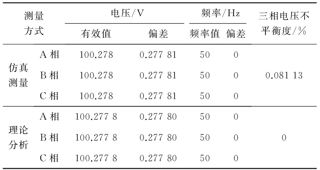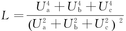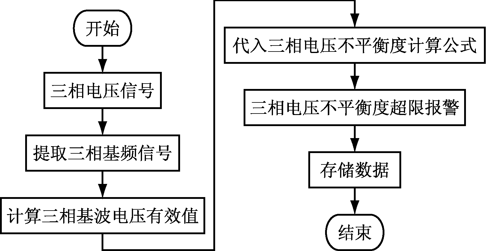 三相电压不平衡度是指电力系统三相电压的不平衡程度。对三相电压不平衡度的测量,一般是按照对称分量法来获取三相中的正序、负序、零序分量,然后按照相应的计算公式推导不平衡度。对于不含有零序分量的电力系统,可利用电能质量标准中的三相电压不平衡度计算公式来求取,通过前期的信号处理提取出基频分量,代入式(4),即可求解出三相电压不平衡度。