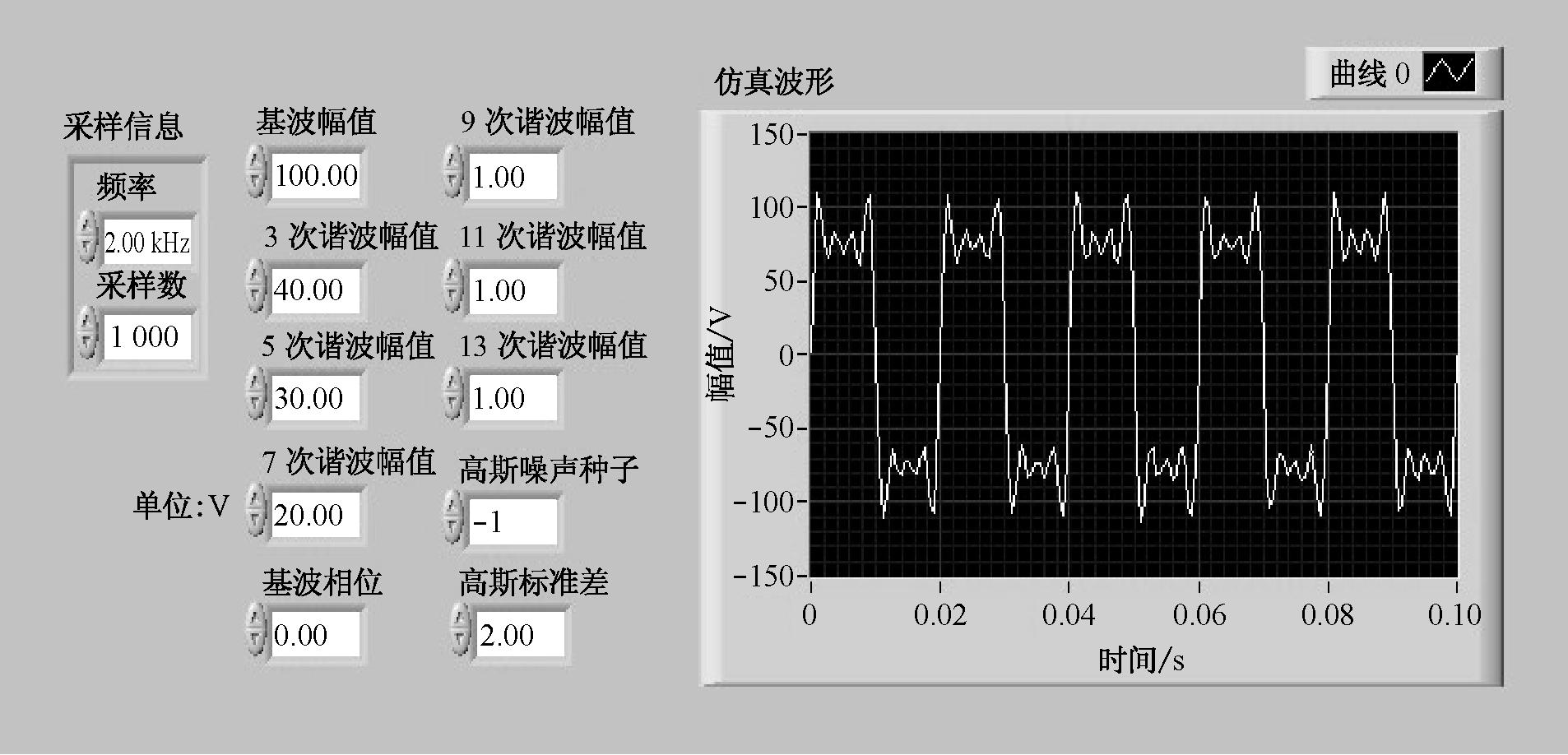 为扩展系统功能、提高系统实用性、方便程序功能展示,系统模拟了含有13次谐波及高斯噪声的三相电源系统,用以产生电压波形,如图5所示。通过对信号源中各参数的设置,可模拟产生特定的波形,利用监测系统可分析仿真信号源的电压质量。