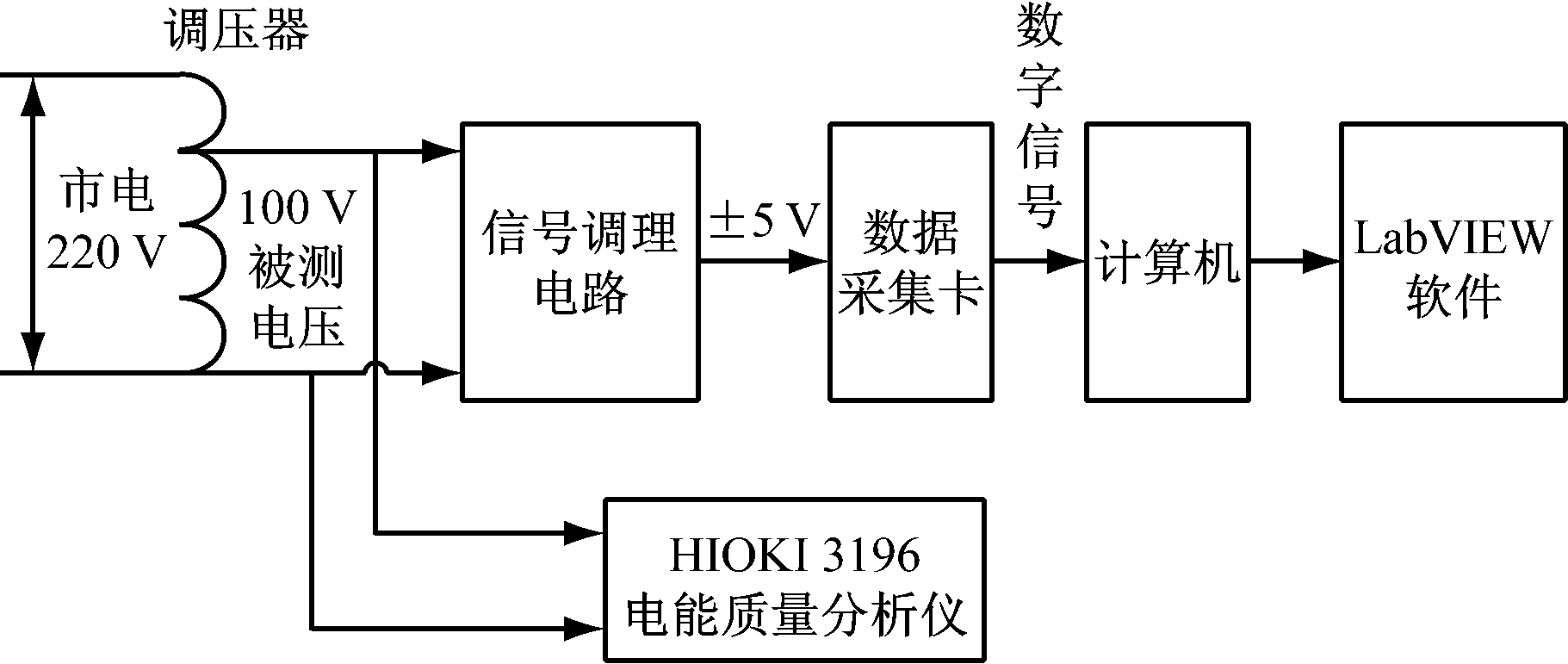 实际测试以煤矿供电三相电源中的一相为例,将额定电压为220 V的单相电源经调压器转换为100 V电压作为待测对象,经系统硬件将信号输入到计算机中供监测软件进行数据处理分析,同时利用HIOKI 3196电能质量分析仪对被测电源进行数据分析。测试电路如图12所示。