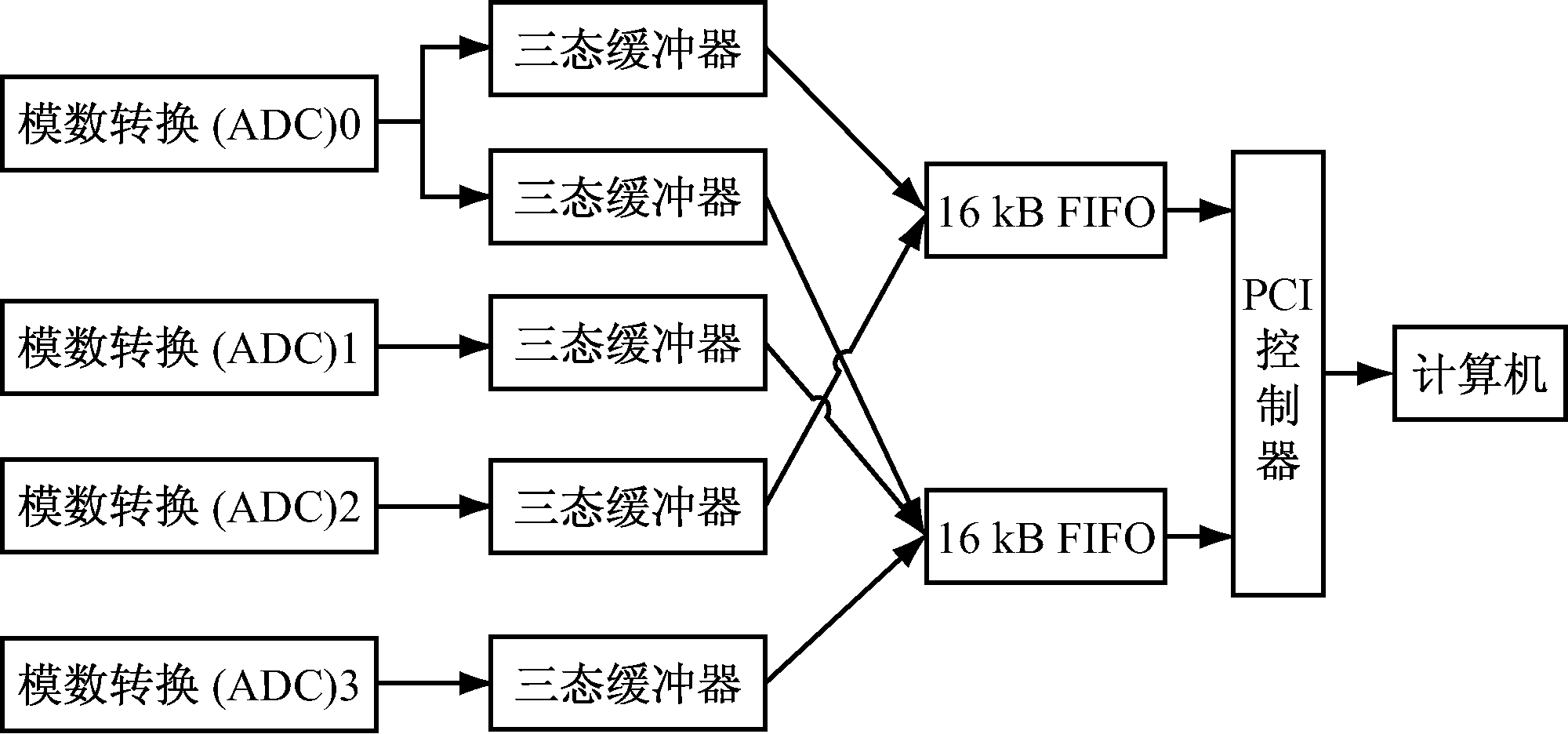 总线控制方式,加快了数据的传输速率,同时拥有软触发、预触发、中间触发、后触发、延时触发等多种触发方式,扩展了高速数据采集卡的应用范围。数据采集卡内部结构如图3所示。