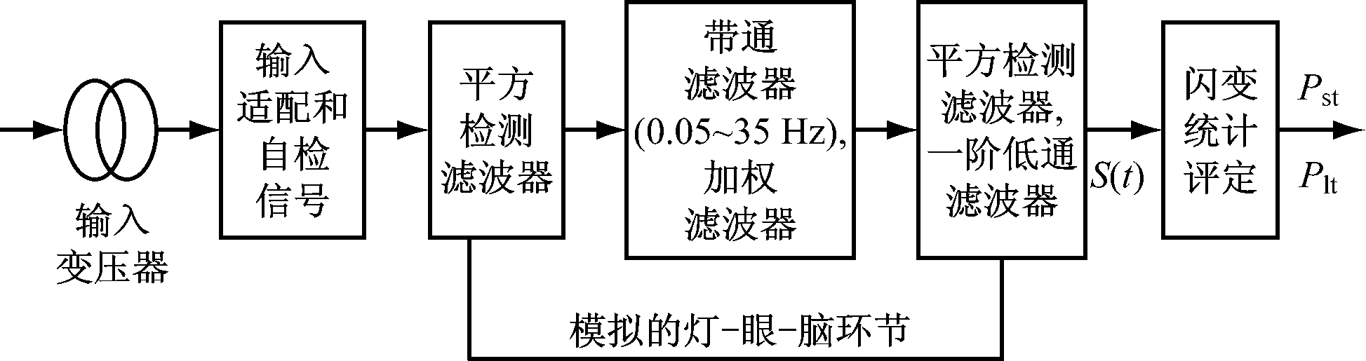 电压闪变的测量采用IEC推荐的闪变测量模型(图9),其测量基础是将信号看成对工频电压波形的调制,经闪变测量模型后即可测量闪变参数值。图9中,S(t)为瞬时闪变视感度函数;Pst为短时闪变量;Plt为长时闪变量。