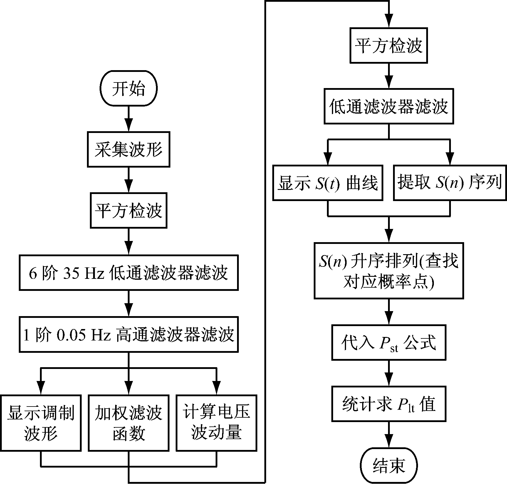 由图9可知,电压闪变的测量模型结合了电压波动的平方检波结构,在电压波动测量程序的基础上经加权滤波、平方、低通滤波后即可进行闪变的统计评定。利用LabVIEW丰富的函数与结构可实现电压波动与闪变的测量。电压波动与闪变测量程序流程如图10所示。图10中,S(n)为瞬时闪变视感度。