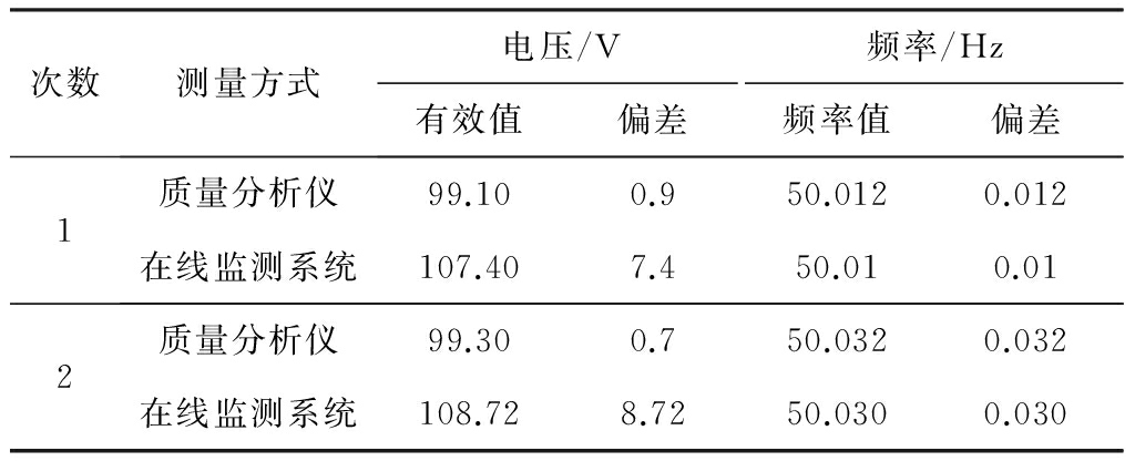 被测电源的电压和频率参数对比结果见表3。以电能质量分析仪的测量数据为参考标准,将设计的煤矿电压质量在线监测系统的数据与其进行对比,量化了本系统的测量误差。