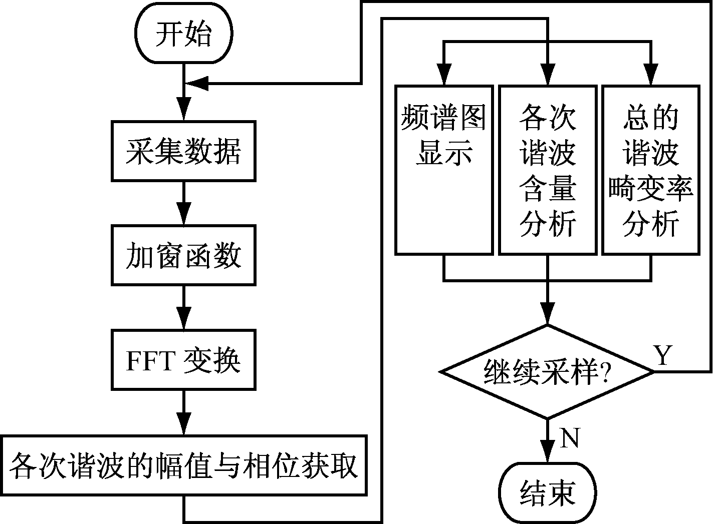 对于谐波问题的分析,LabVIEW提供了多种函数模块[8]:FFT变换幅值-相位谱函数,FFT变换实部-虚部函数,小波变换函数及Mathscript节点函数等。谐波分析程序采用了LabVIEW内建的谐波分析模块及FFT幅值-相位谱函数,通过与加窗函数结合,有效地减少了FFT变换的频谱泄漏问题与栅栏效应,得到基波频率、各次谐波幅值和总的谐波畸变率、频谱图等谐波参量。谐波分析程序流程如图7所示。